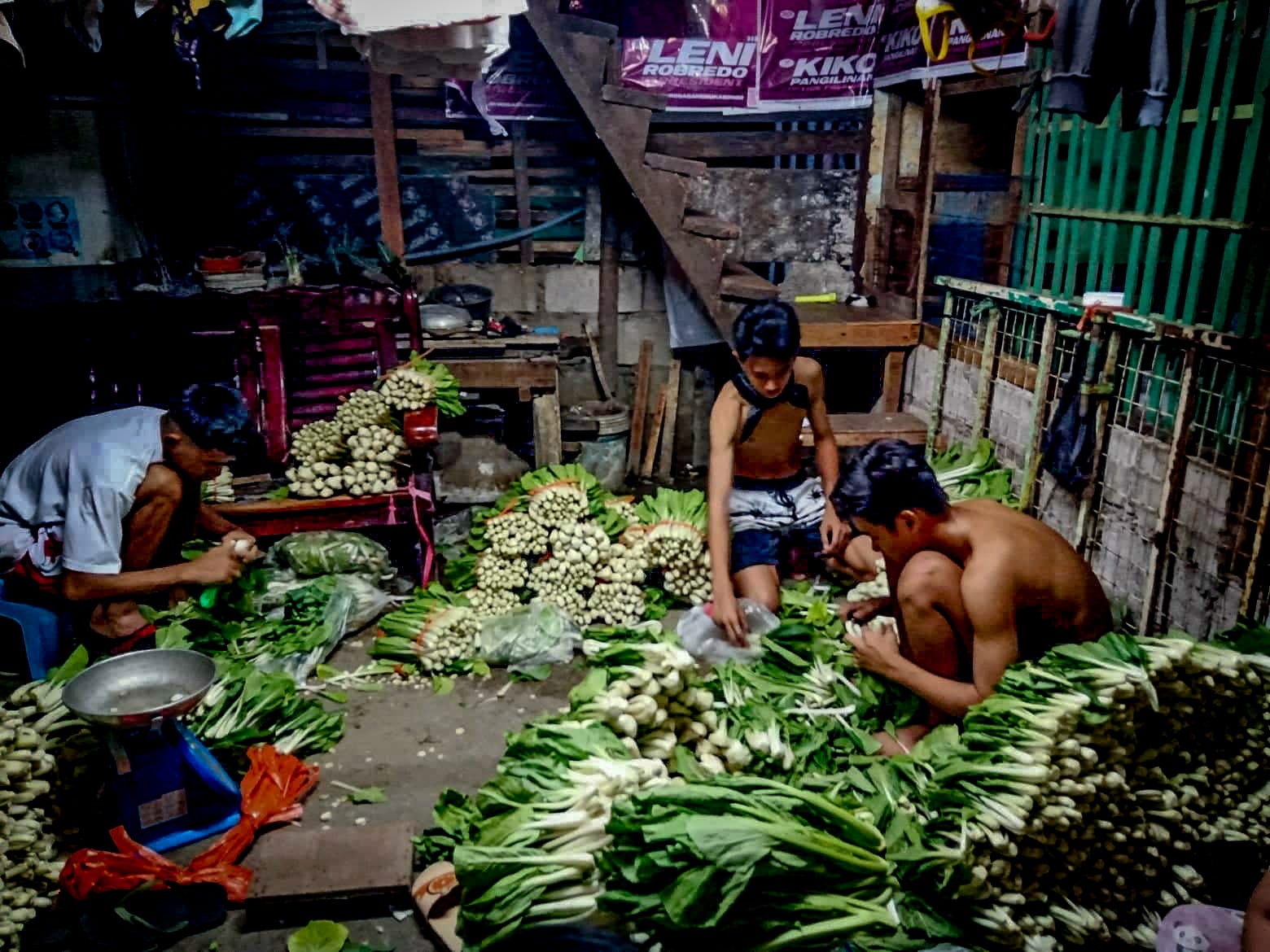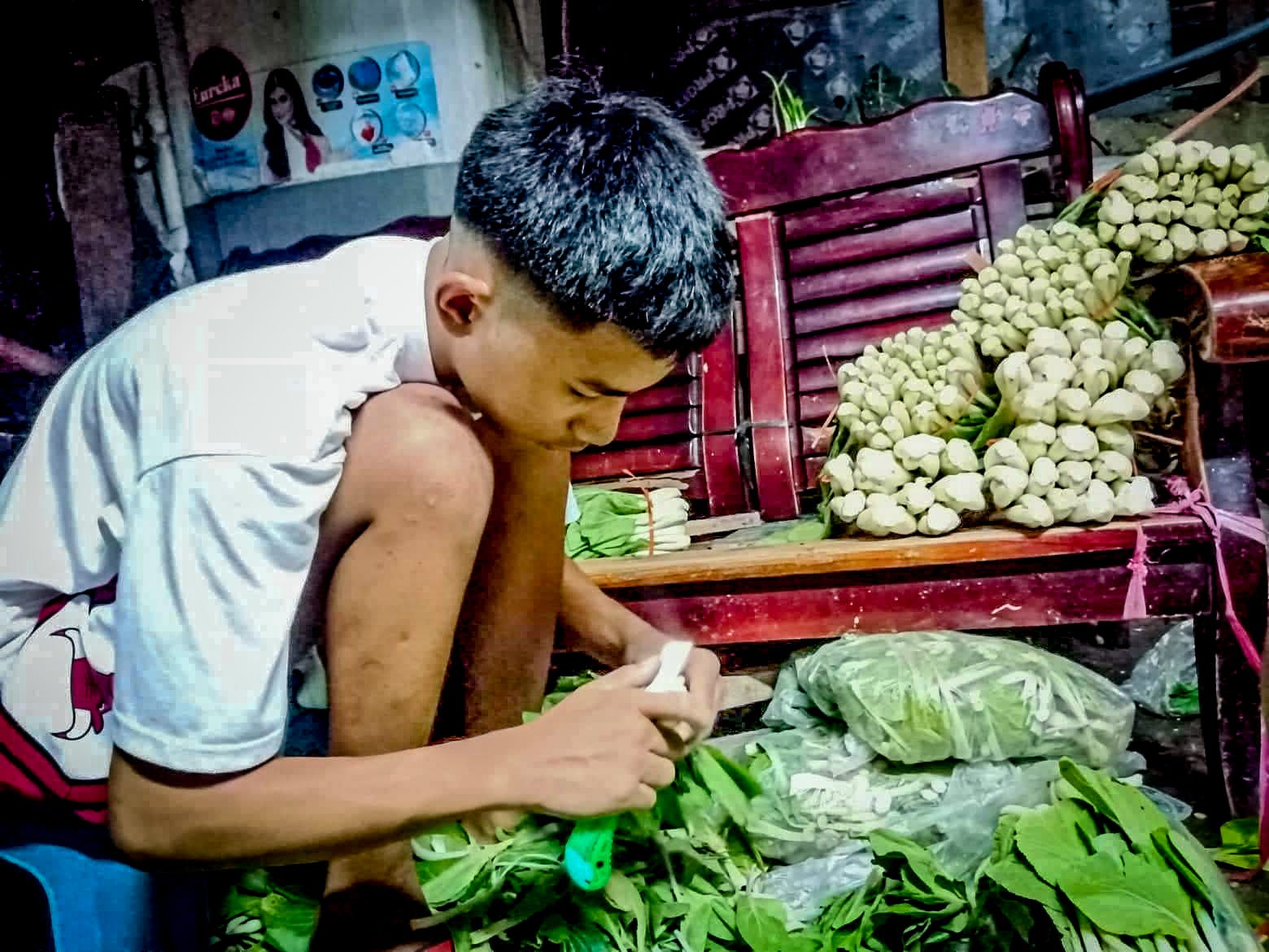 Sina Romulo Jr. at John Kenedick ang nadatnan kong naghihimay ng pechay. Mga high school student sa Pateros National High School. Tuwing hapon pagkatapos ng kanilang klase ay dumidiretso sila dito upang maghimay at magtali ng mga panindang pechay. Mula noong magpandemya, ito na ang kanilang nakasanayang gawin upang makatulong na rin sa kanilang pang araw-araw na pagkain.